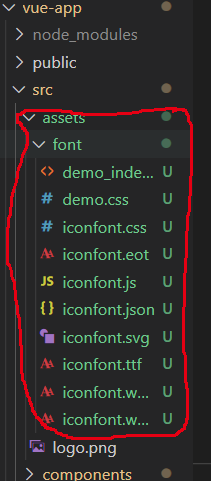 会得到一个压缩文件夹,打开这个文件,复制里面所有 iconfont 命名的文件,在 vue 项目中新建一个文件夹存放这些文件,我这里是在assets 文件夹下新建 iconfont 文件夹。