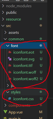 会得到一个压缩文件夹,打开这个文件,复制里面所有 iconfont 命名的文件,在 vue 项目中新建一个文件夹存放这些文件,我这里是在assets 文件夹下新建 iconfont 文件夹。